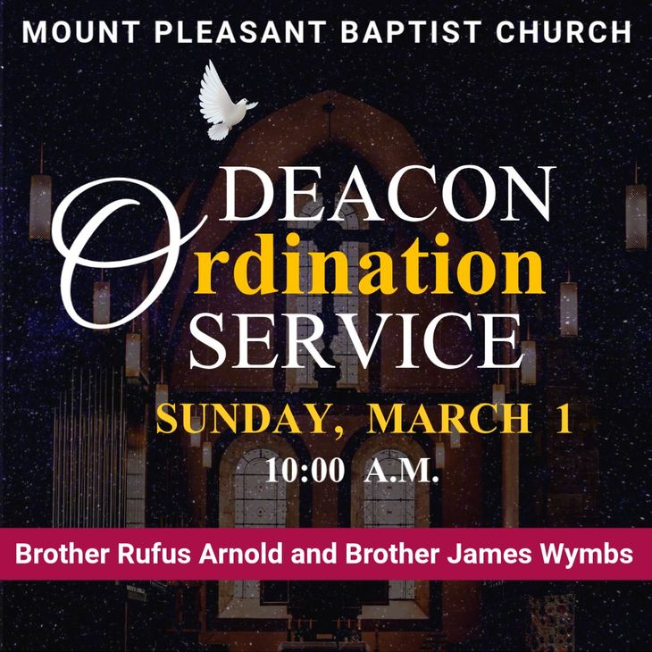 On Sunday, March 1, 2026, we will have our Deacon Ordination Service for Brother Rufus Arnold and Brother James Wymbs. Please join us and witness this special occasion as they dedicate their service to God and our church family.