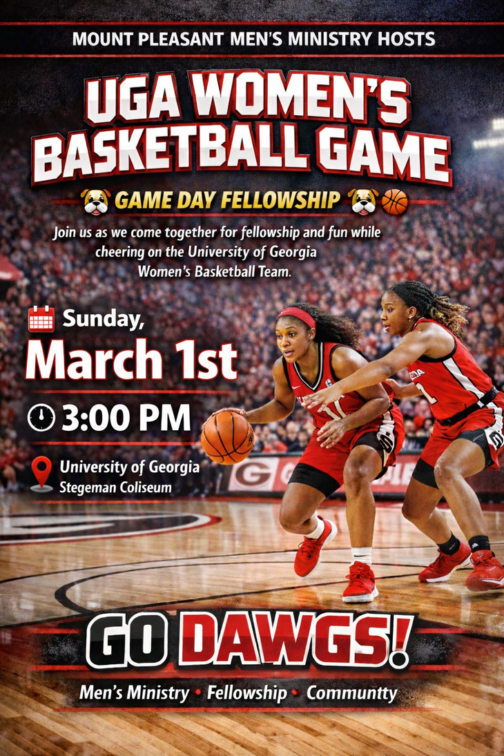The Men's Ministry will be hosting a UGA Women's Basketball Game Day Fellowship on March 1st at 3:00 pm. For those who are interested please sign up. Join us as we come together for fellowship and fun while cheering on the University of Georgia Women's Basketball Team.